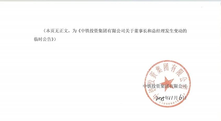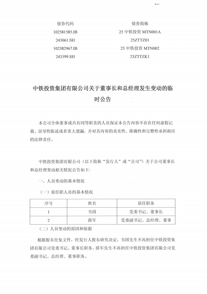 11月6日,中铁投资集团有限公司发布公告,根据股东任免文件,韦国不再担任党委书记、董事长,薛军不再担任党委副书记、总经理、董事;王国明被聘任为党委书记、董事长,李少利被聘任为党委副书记、总经理、董事。上述人事任免已完成必要审批程序,公司将尽快办理工商变更登记及备案手续。