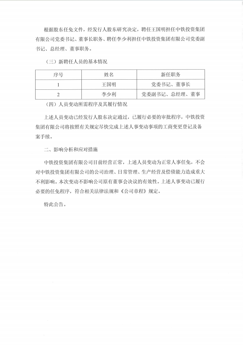 中铁投资集团:王国明接任党委书记、董事长,李少利任总经理