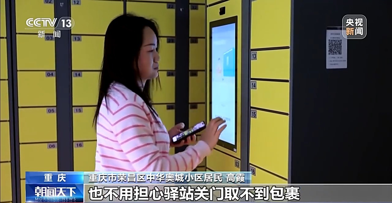 重庆市荣昌区中华奥城小区居民 高霞:确实很方便,有时候过年过节,像我们晚上下班回来晚了,也不用担心驿站关门取不到包裹,现在24小时都可以取了。
