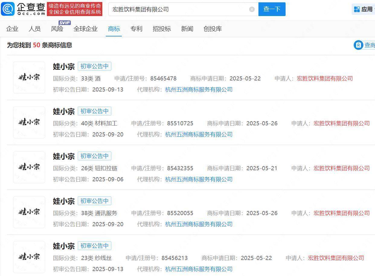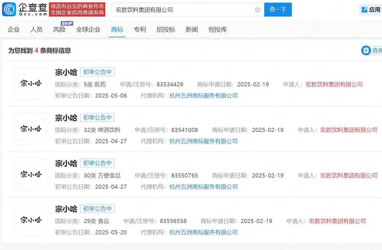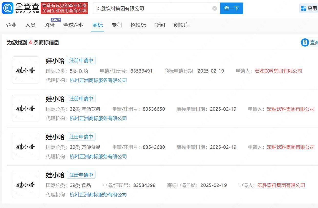 企查查显示,今年2月以来配资门开户官网,宗馥莉任董事的宏胜饮料集团有限公司申请注册多枚“娃小宗”、“娃小哈”、“宗小哈”商标,国际分类涉及啤酒饮料、方便食品、材料加工等。目前“娃小哈”商标状态在注册申请中,“娃小宗”、“宗小哈”商标处于初审公告状态。(信网记者)
